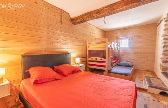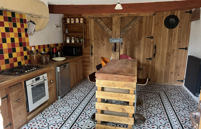 d 'une cuisine aménagée, un grand séjour sur tomettes, une cheminée en pierre avec poele à bois, cellier, salle d 'eau et wc. A l 'étage: par un escalier en bois et