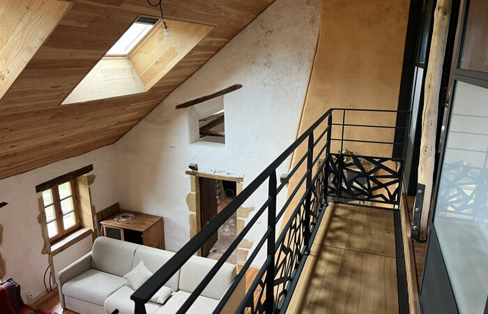rampe en fer forgé, bel espace avec salon, deux chambres dont une sur tomettes, salle d 'eau et wc. Au-dessus : deux autres chambres mensardées sur parquet,