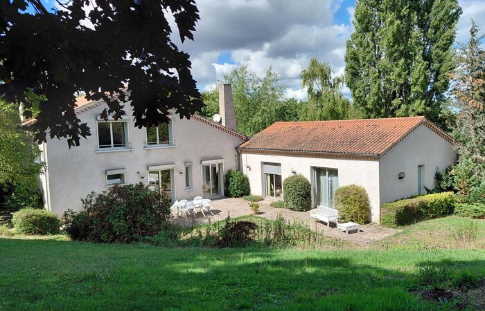 Réf 03-5118. A 35mn au Nord de Roanne, 5mn de La Pacaudière, maison d'architecte sur parc clos et arboré de 11488 m2. Rez-de-chaussée : hall d'entrée, cuisine équipée ouvrant sur terrasse exposée Sud-Est, vaste séjour-salon-bibliothèque (50 m2) avec cheminée à foyer fermé, petit balcon. Espace nuit : 2 suites parentales, dressing. Etage : palier avec placards muraux, 3 chambres dont une avec point d'eau, placards, bureau, salle d'eau-wc, grenier. Au sous sol : une pièce, garage-atelier (1 place). Garage (plusieurs places). Cave. Double vitrage en aluminium. Volets roulants électriques. Chauffage central fuel, cheminée et pompe à chaleur. Puits. Tout à l'égout. A l'abri des regards, proche des commodités et écoles. Logement à consommation énergétique excessive : Classe E. Plus d'informations au 06-85-29-73-39.