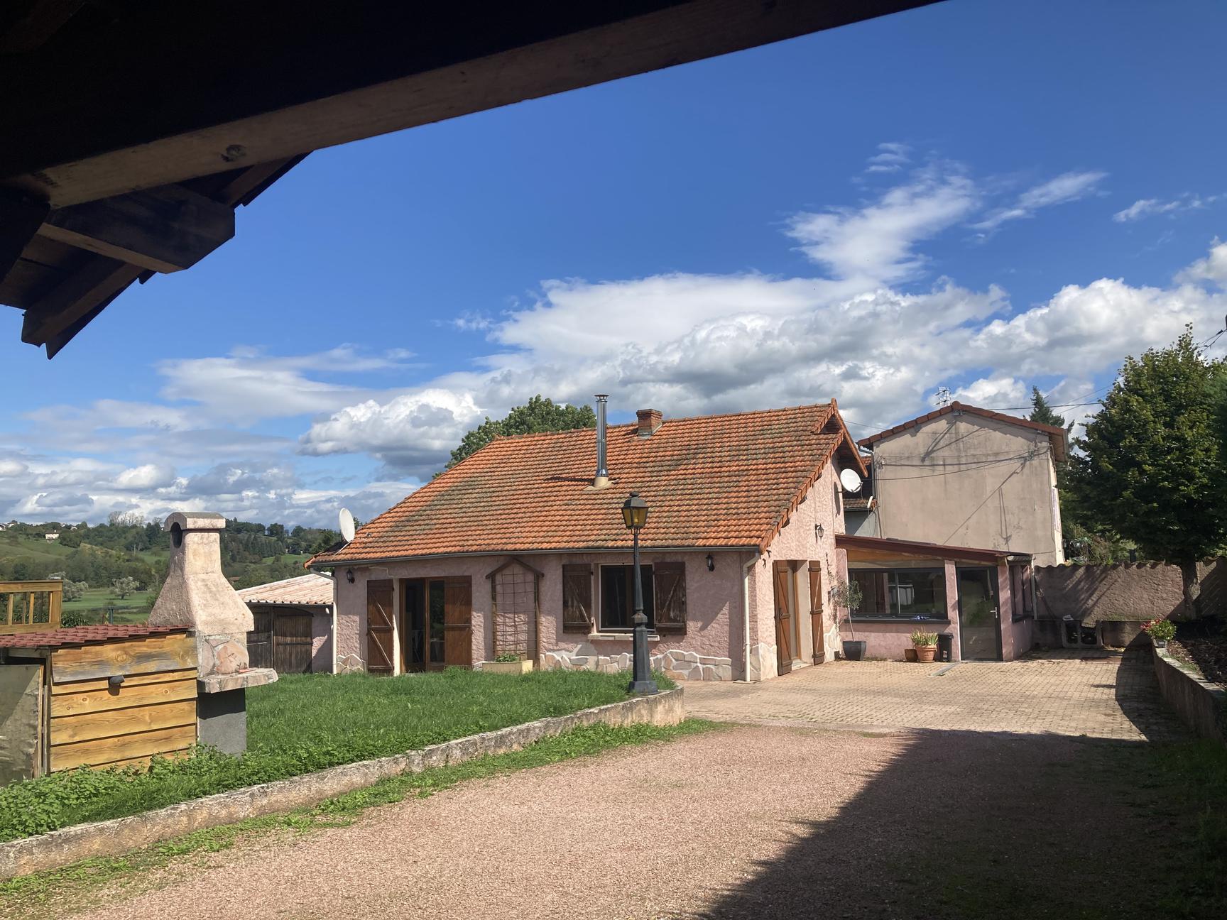 Réf 03-5122. EXCLUSIVITÉ. Près de Charlieu, à POUILLY SOUS CHARLIEU (42), maison d'habitation de 104 m2 sur 893 m2 de terrain clos comprenant : hall d'entrée, cuisine aménagée, salon (cheminée à foyer fermé), séjour, dégagement, salle d'eau-wc. A l'étage : 2 chambres. Double vitrage sur menuiseries bois. Chauffage central fuel et cheminée. Véranda. Garage séparé. Local. Abri voiture. Cour et terrain clos avec portail électrique et interphone. Puits. Logement à consommation énergétique excessive : Classe E Plus d'informations au 06-85-29-73-39.