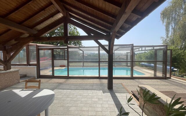 Réf : 05-5119. À 1h au nord-ouest de Lyon, 20 minutes de Roanne, à COMBRE, villa des années 2000, élevée sur sous-sol complet avec piscine couverte. Cette maison comprend en rez-de-jardin : une terrasse côté sud avec stores, une entrée avec placards de rangement, une véranda, un salon...